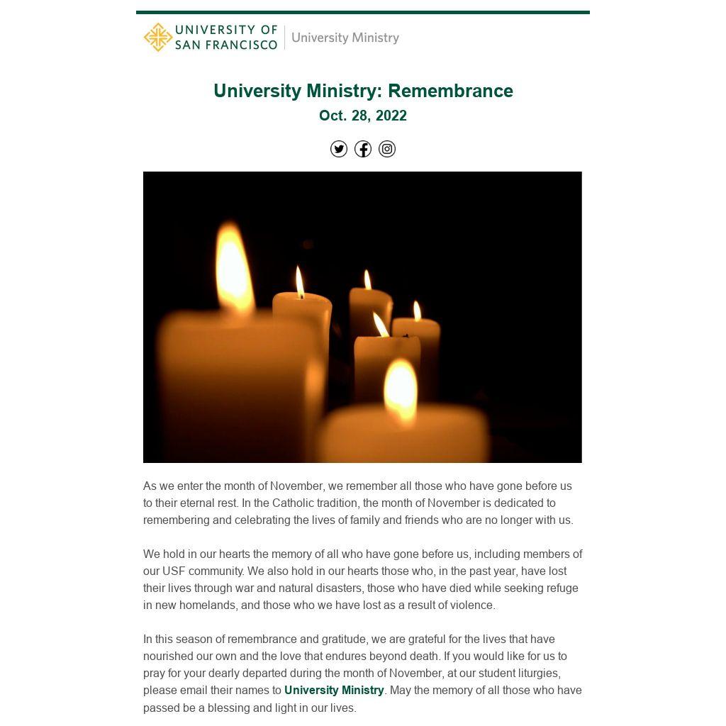 In this season of remembrance and gratitude, we are grateful for the lives that have nourished our own and the love that endures beyond death. If you would like for us to pray for your dearly departed during the month of November, at our student liturgies, please email their names to University Ministry. May the memory of all those who have passed be a blessing and light in our lives.