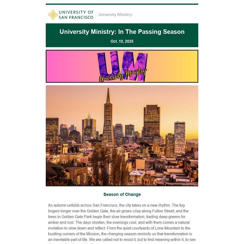 This fall, may we remember that community is a sacred act, one that requires openness, acceptance, and love. As the light fades earlier over Lone Mountain, may we carry our own light into the world, into our studies, our friendships, and our city. Together, as a diverse and interfaith community, we embody what makes USF and San Francisco itself so special: a place where change is not something to fear, but something to embrace as a pathway toward deeper understanding, unity, and hope.