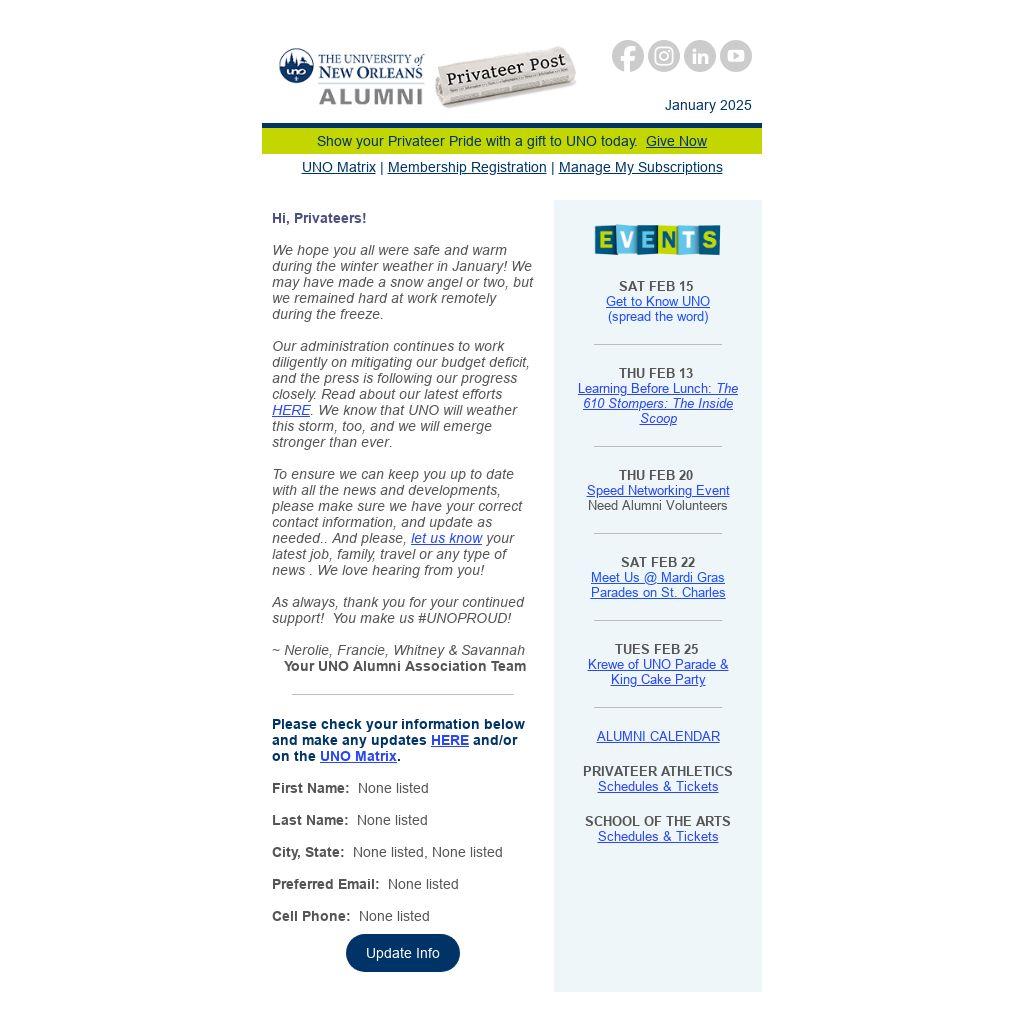 Please check your information below and make any updates HERE and/or on the UNO Matrix.