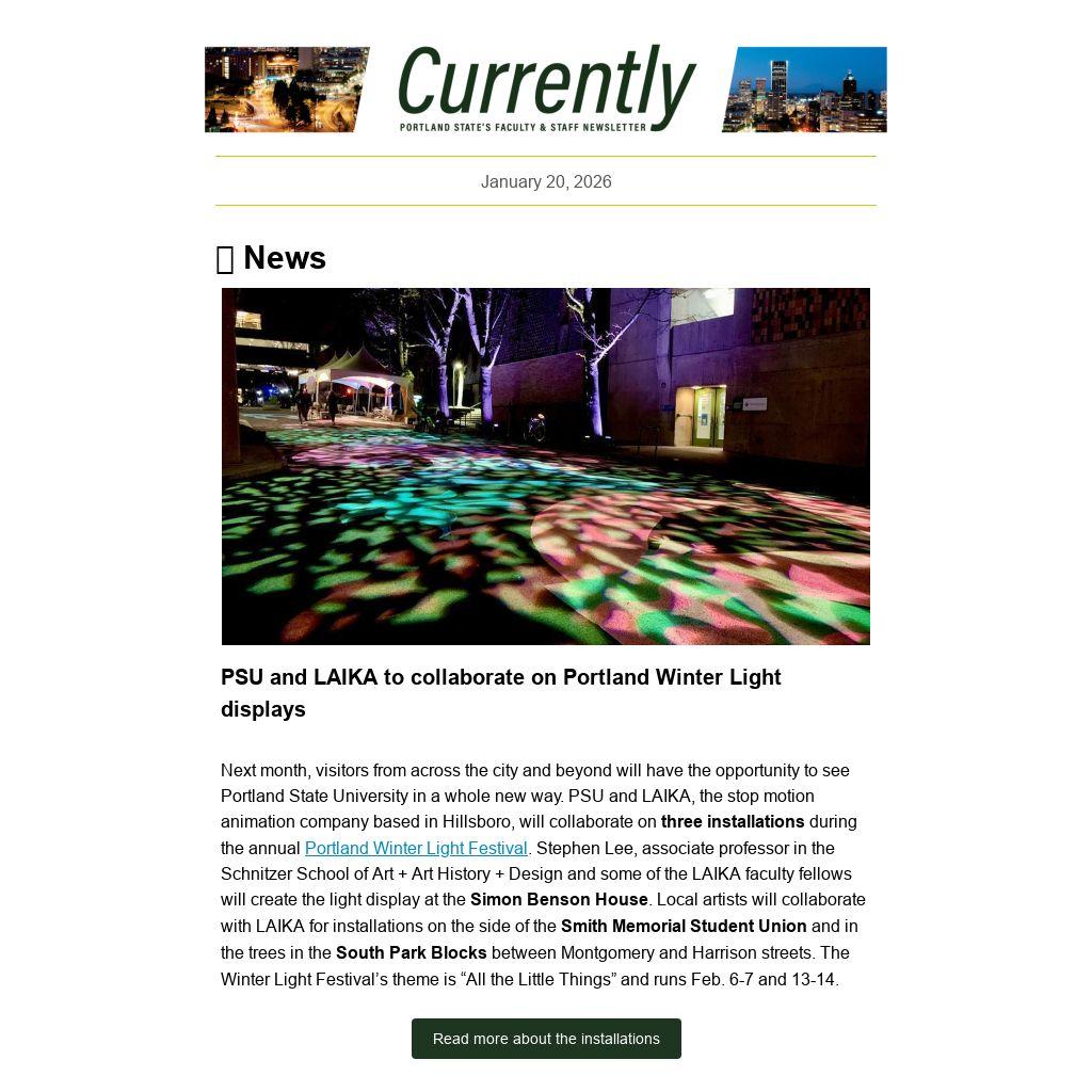 CURRENTLY is a weekly newsletter for the employees of Portland State University, published by University Communications. News items, events and accolades should be sent to currently@pdx.edu. Deadline is noon, the Tuesday before publication. See the Currently website for submission guidelines and schedule.