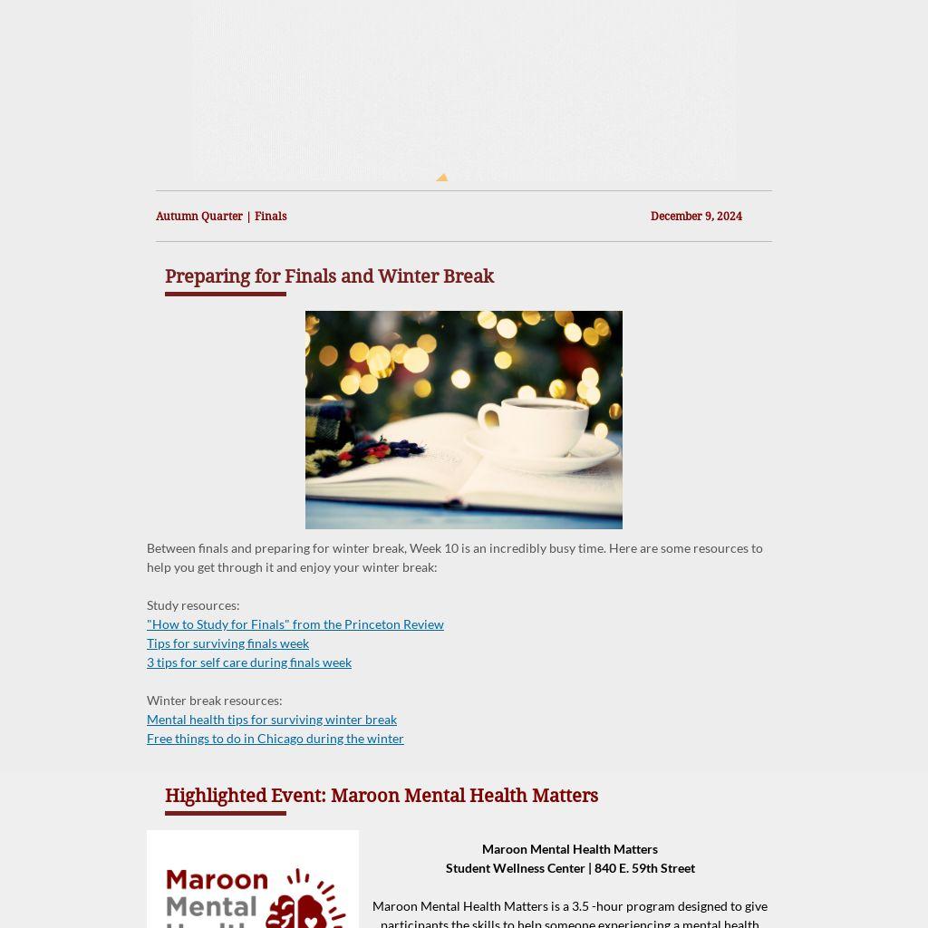 Maroon Mental Health Matters is a 3.5 -hour program designed to give participants the skills to help someone experiencing a mental health challenge or crisis tailored specifically for the University of Chicago. community. It uses didactics, role-playing, and group discussion to help participants appropriately recognize and respond to mental health concerns or emotional crises. Register for an upcoming student training or staff/faculty training .