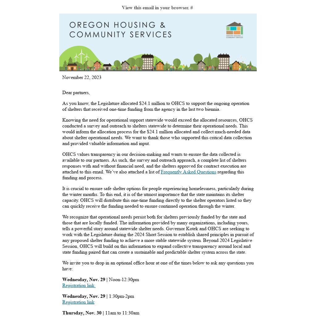 As you know, the Legislature allocated $24.1 million to OHCS to support the ongoing operation of shelters that received one-time funding from the agency in the last two biennia.