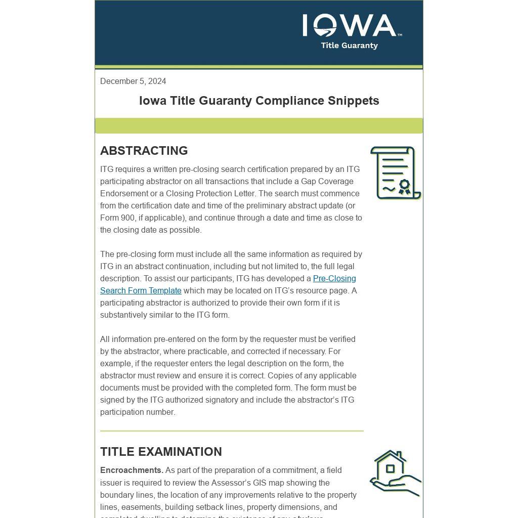 The pre-closing form must include all the same information as required by ITG in an abstract continuation, including but not limited to, the full legal description. To assist our participants, ITG has developed a Pre-Closing Search Form Template which may be located on ITG’s resource page. A participating abstractor is authorized to provide their own form if it is substantively similar to the ITG form.