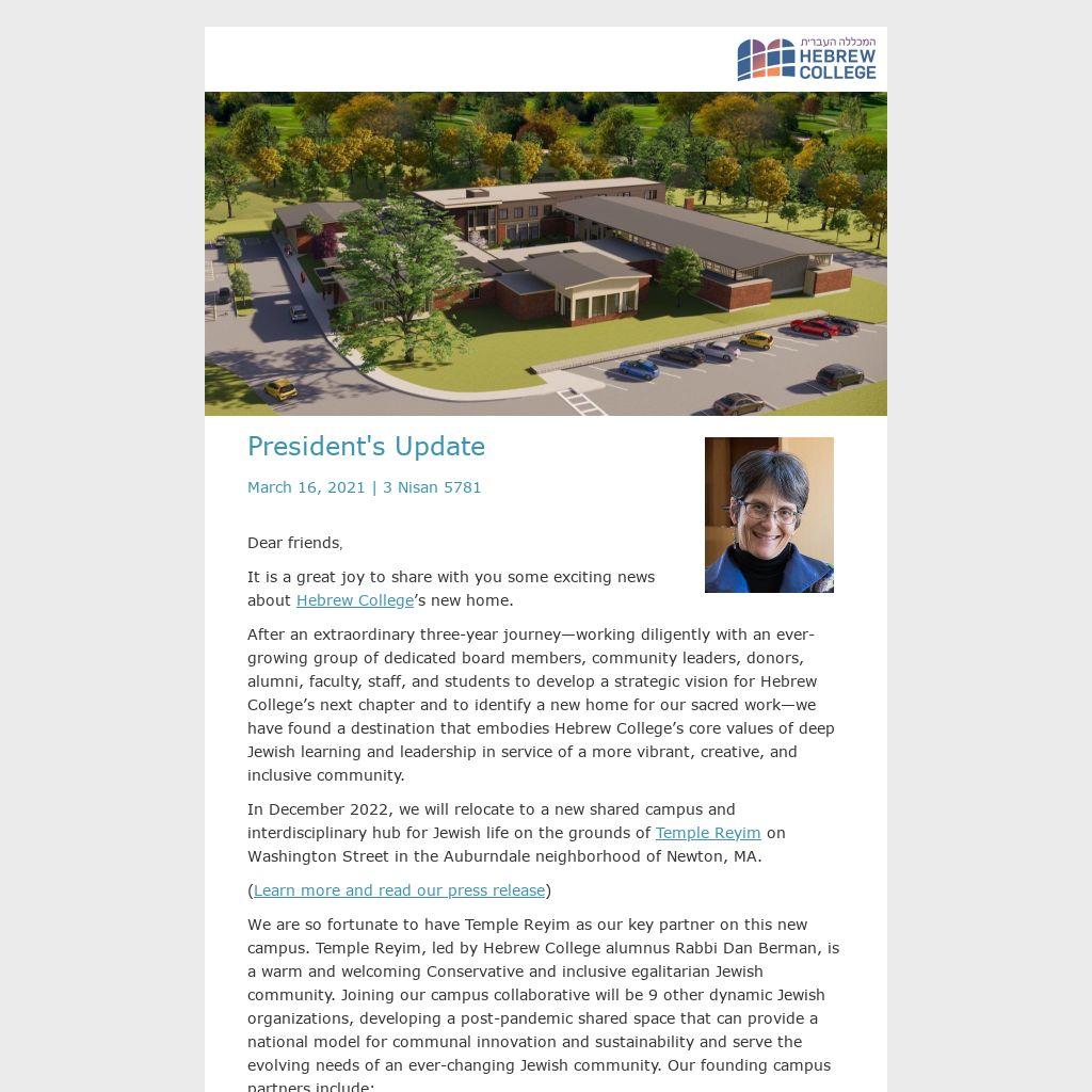 It is a great joy to share with you some exciting news about Hebrew College’s new home.