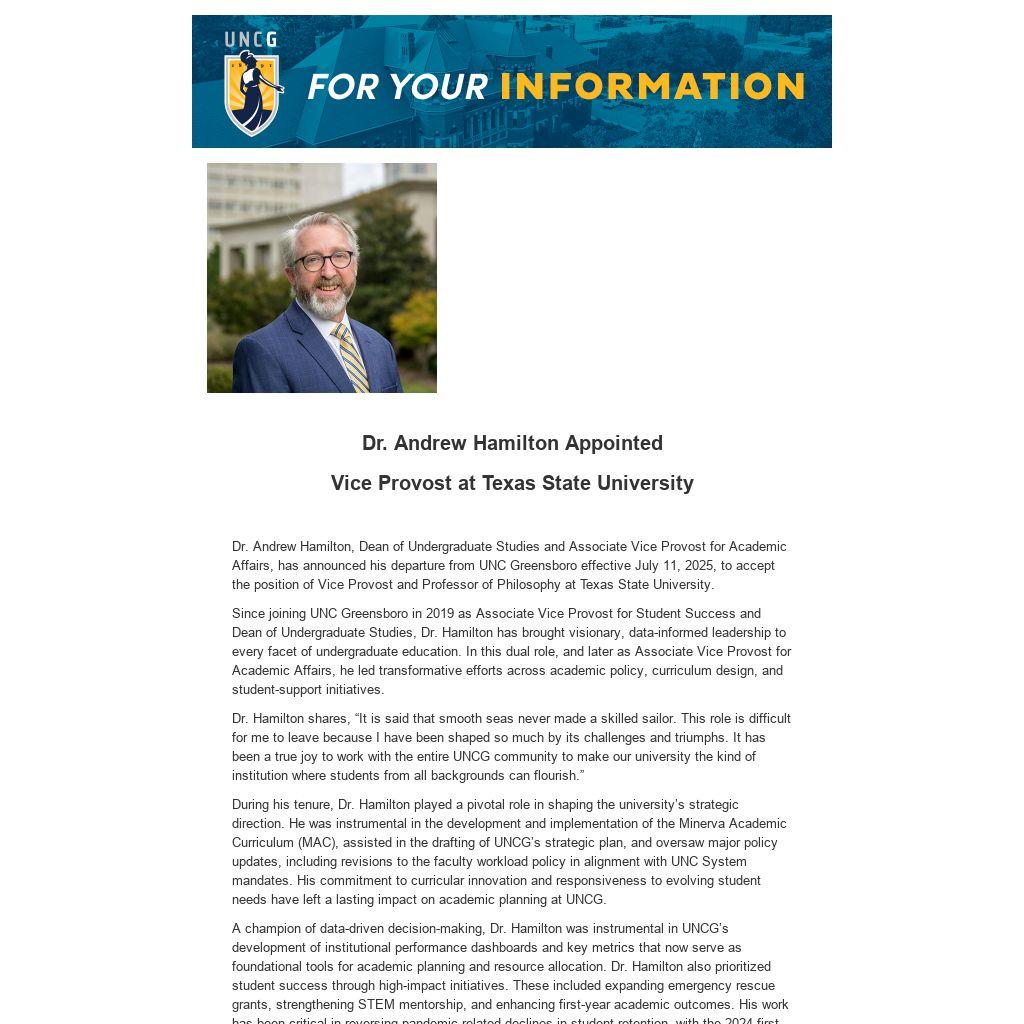 Dr. Andrew Hamilton, Dean of Undergraduate Studies and Associate Vice Provost for Academic Affairs, has announced his departure from UNC Greensboro effective July 11, 2025, to accept the position of Vice Provost and Professor of Philosophy at Texas State University.