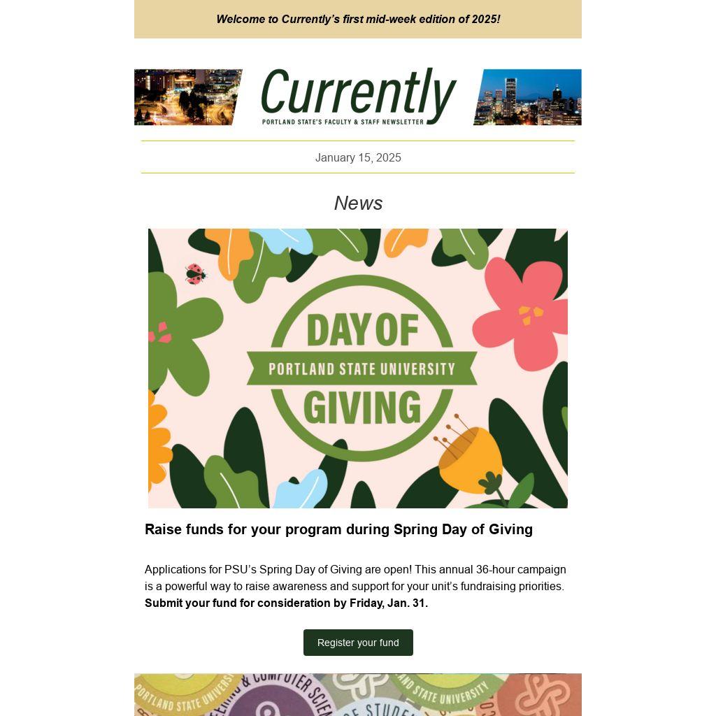 CURRENTLY is a weekly newsletter for the employees of Portland State University, published by University Communications. News items, events and accolades should be sent to currently@pdx.edu. Deadline is noon, the Tuesday before publication. See the Currently website for submission guidelines and schedule.