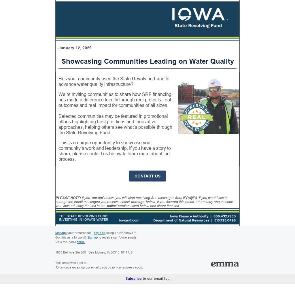 Selected communities may be featured in promotional efforts highlighting best practices and innovative approaches, helping others see what’s possible through the State Revolving Fund.