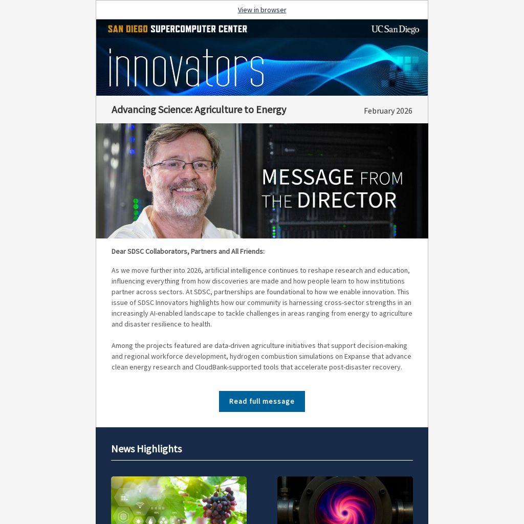 As we move further into 2026, artificial intelligence continues to reshape research and education, influencing everything from how discoveries are made and how people learn to how institutions partner across sectors. At SDSC, partnerships are foundational to how we enable innovation. This issue of SDSC Innovators highlights how our community is harnessing cross-sector strengths in an increasingly AI-enabled landscape to tackle challenges in areas ranging from energy to agriculture and disaster resilience to health.
