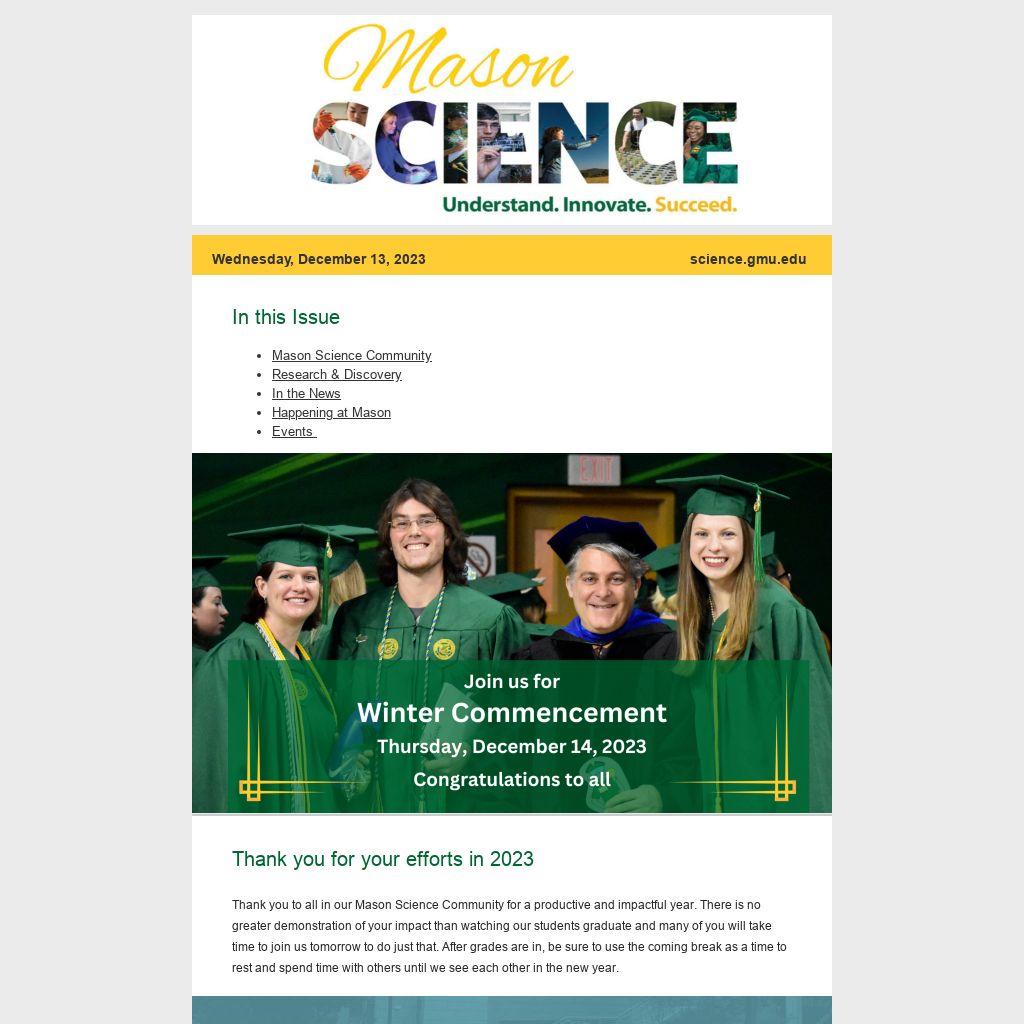 Thank you to all in our Mason Science Community for a productive and impactful year. There is no greater demonstration of your impact than watching our students graduate and many of you will take time to join us tomorrow to do just that. After grades are in, be sure to use the coming break as a time to rest and spend time with others until we see each other in the new year.