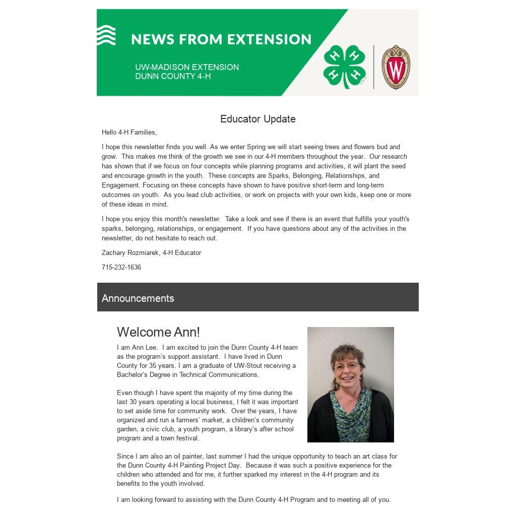 I hope this newsletter finds you well. As we enter Spring we will start seeing trees and flowers bud and grow. This makes me think of the growth we see in our 4-H members throughout the year. Our research has shown that if we focus on four concepts while planning programs and activities, it will plant the seed and encourage growth in the youth. These concepts are Sparks, Belonging, Relationships, and Engagement. Focusing on these concepts have shown to have positive short-term and long-term outcomes on youth. As you lead club activities, or work on projects with your own kids, keep one or more of these ideas in mind.