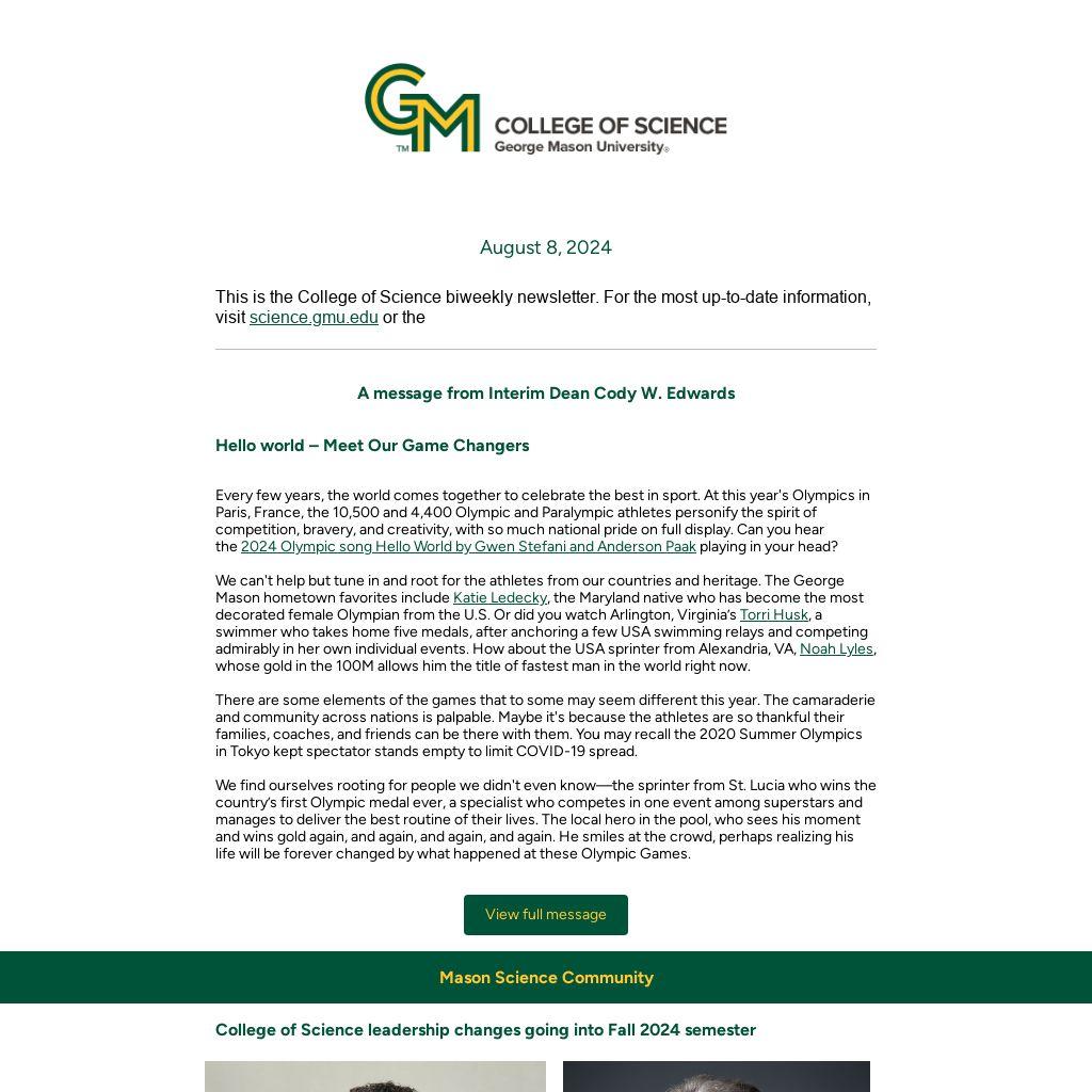 This is the College of Science biweekly newsletter. For the most up-to-date information, visit science.gmu.edu or the |