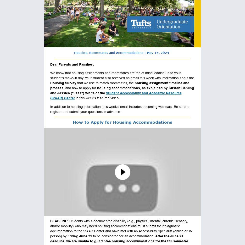 We know that housing assignments and roommates are top of mind leading up to your student's move-in day. Your student also received an email this week with information about the Housing Survey that we use to match roommates, the housing assignment timeline and process, and how to apply for housing accommodations, as explained by Kirsten Behling and Jessica ("Jess") White of the Student Accessibility and Academic Resource (StAAR) Center in this week's featured video.