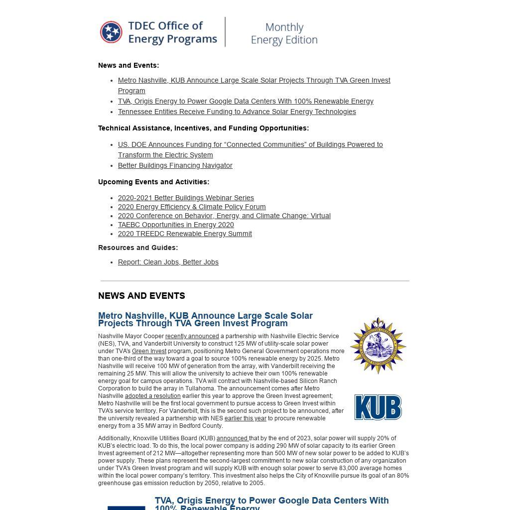 TVA announced that a new 100 MW solar array constructed in Obion County will provide renewable energy to Google’s data centers in Clarksville as well as in Hollywood, AL. Through TVA’s Green Invest program, Origis Energy will own and operate the plant, which is expected to be operational by the end of 2022. Earlier this year, Google had entered into a separate Green Invest agreement to purchase 266 MW of solar power capacity generated by arrays linked to TVA’s electric grid, an arrangement that follows similar deals with other companies operating in Tennessee such as General Motors and Facebook. See TVA’s official press release to learn more.