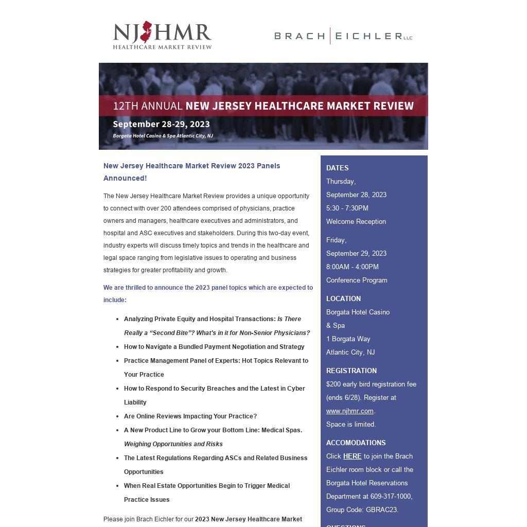 Please join Brach Eichler for our 2023 New Jersey Healthcare Market Review (NJHMR), September 28-29, 2023 at the Borgata Hotel Casino & Spa in Atlantic City, NJ.