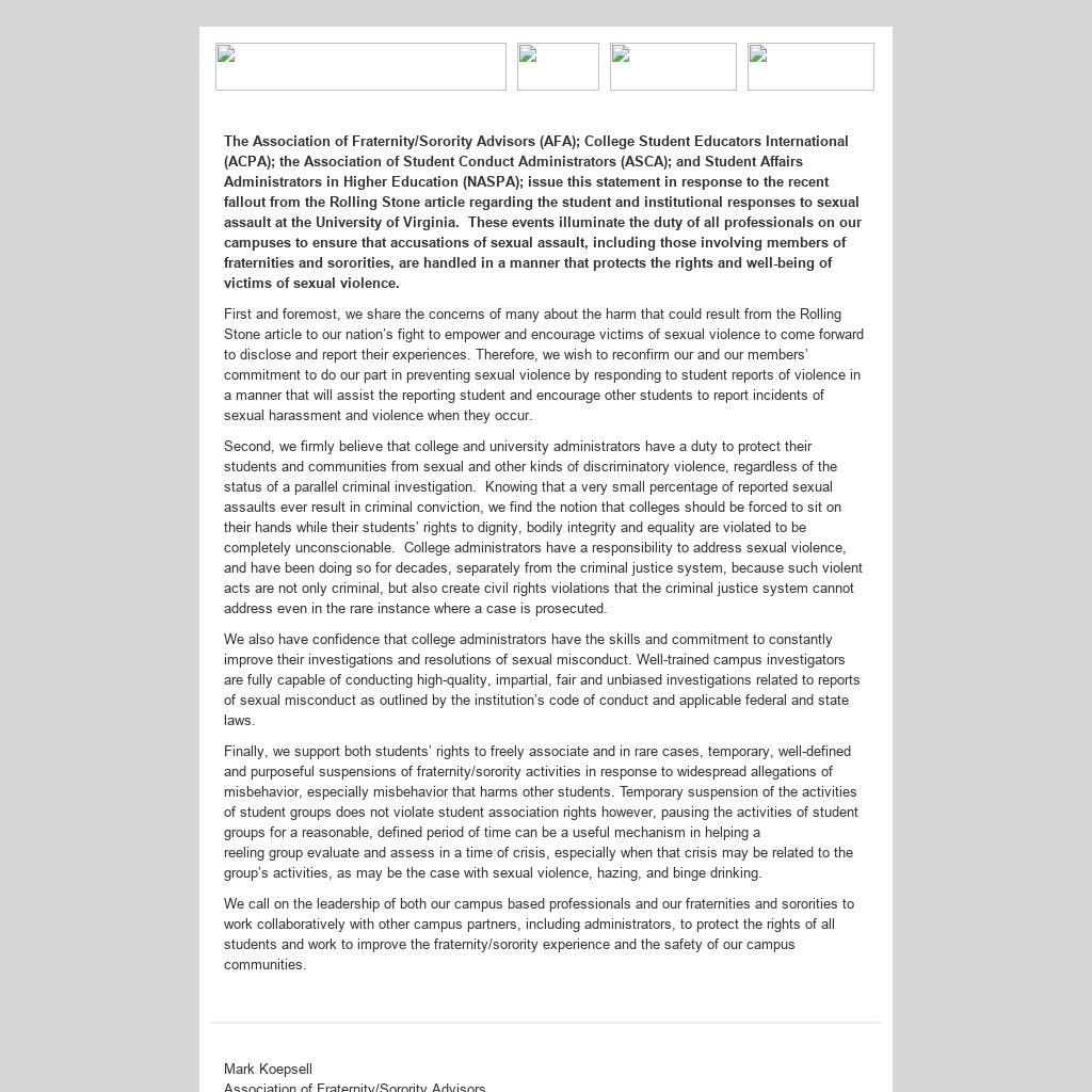The Association of Fraternity/Sorority Advisors (AFA); College Student Educators International (ACPA); the Association of Student Conduct Administrators (ASCA); and Student Affairs Administrators in Higher Education (NASPA); issue this statement in response to the recent fallout from the Rolling Stone article regarding the student and institutional responses to sexual assault at the University of Virginia. These events illuminate the duty of all professionals on our campuses to ensure that accusations of sexual assault, including those involving members of fraternities and sororities, are handled in a manner that protects the rights and well-being of victims of sexual violence.
