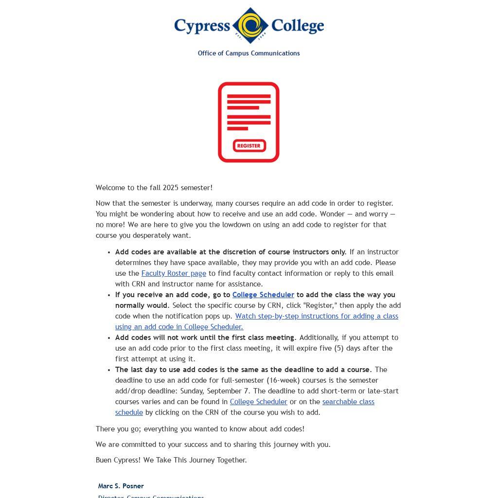 - Add codes are available at the discretion of course instructors only. If an instructor determines they have space available, they may provide you with an add code. Please use the Faculty Roster page to find faculty contact information or reply to this email with CRN and instructor name for assistance.