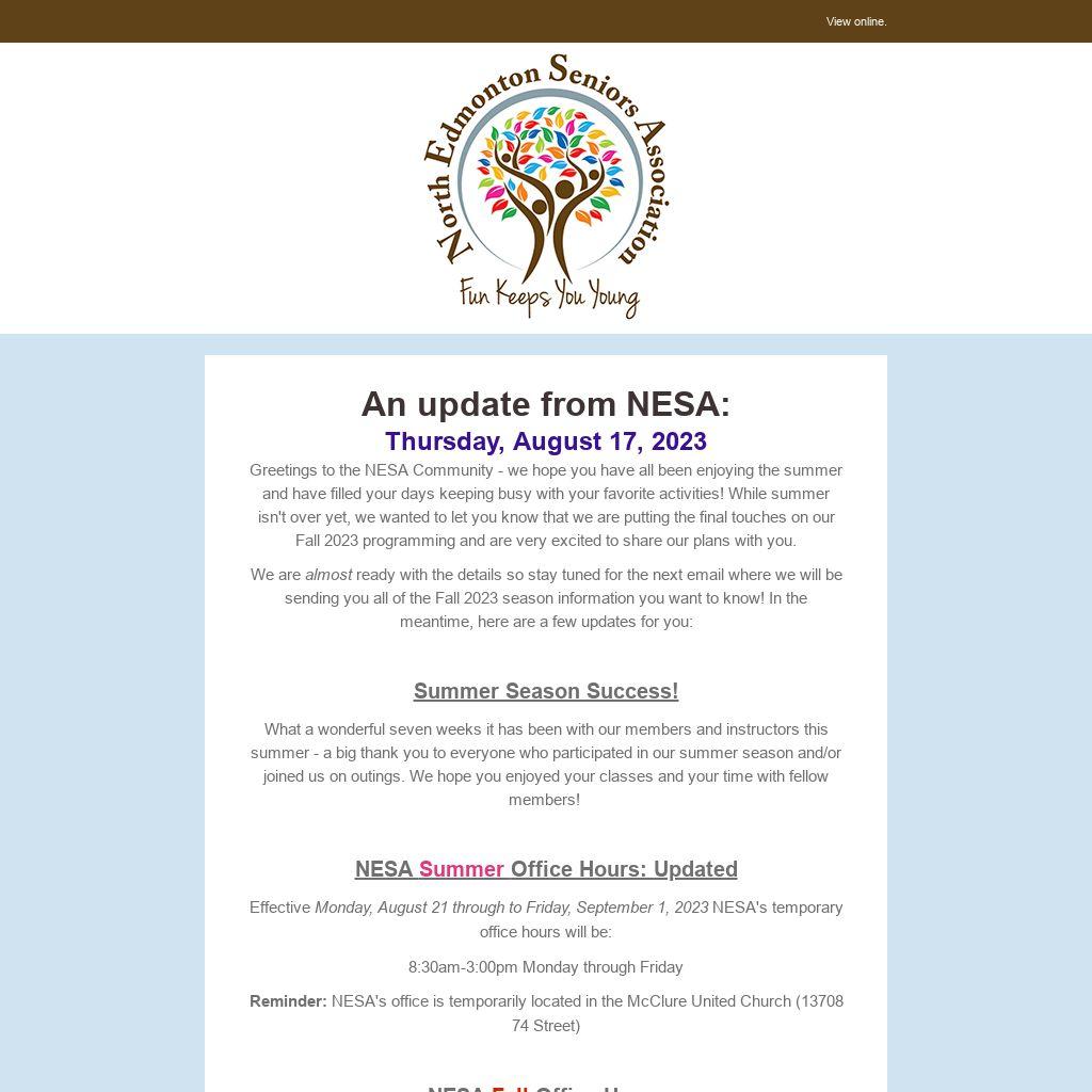 Greetings to the NESA Community - we hope you have all been enjoying the summer and have filled your days keeping busy with your favorite activities! While summer isn't over yet, we wanted to let you know that we are putting the final touches on our Fall 2023 programming and are very excited to share our plans with you.