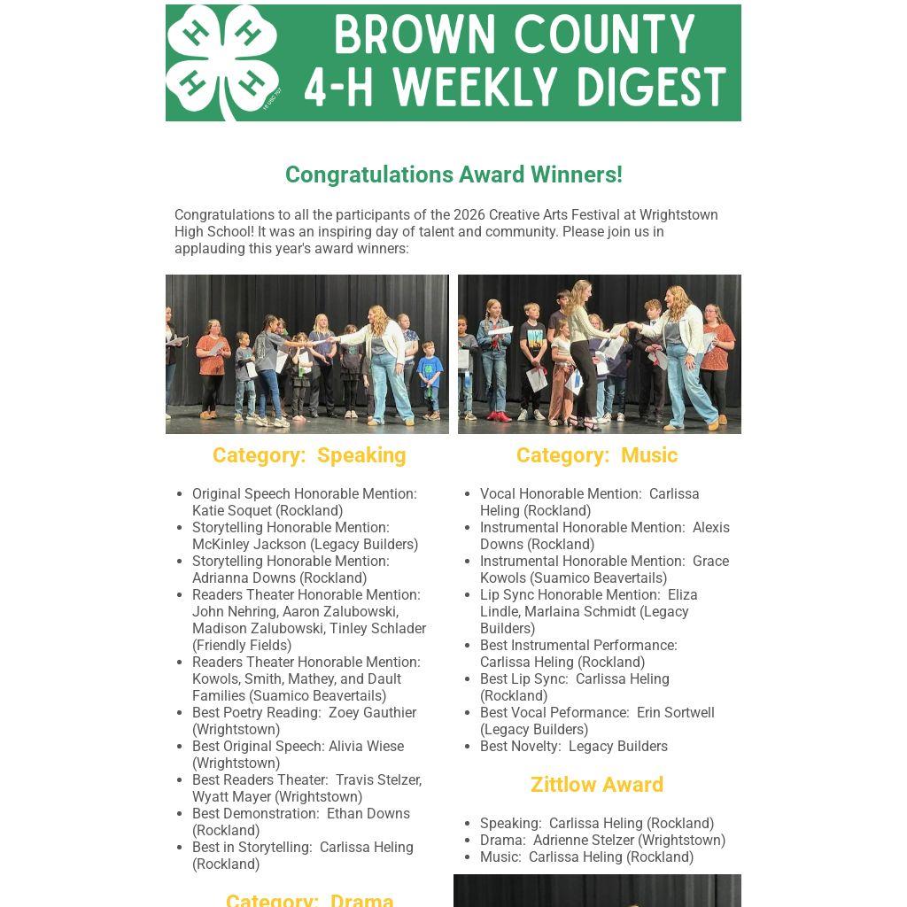 - Readers Theater Honorable Mention: John Nehring, Aaron Zalubowski, Madison Zalubowski, Tinley Schlader (Friendly Fields)