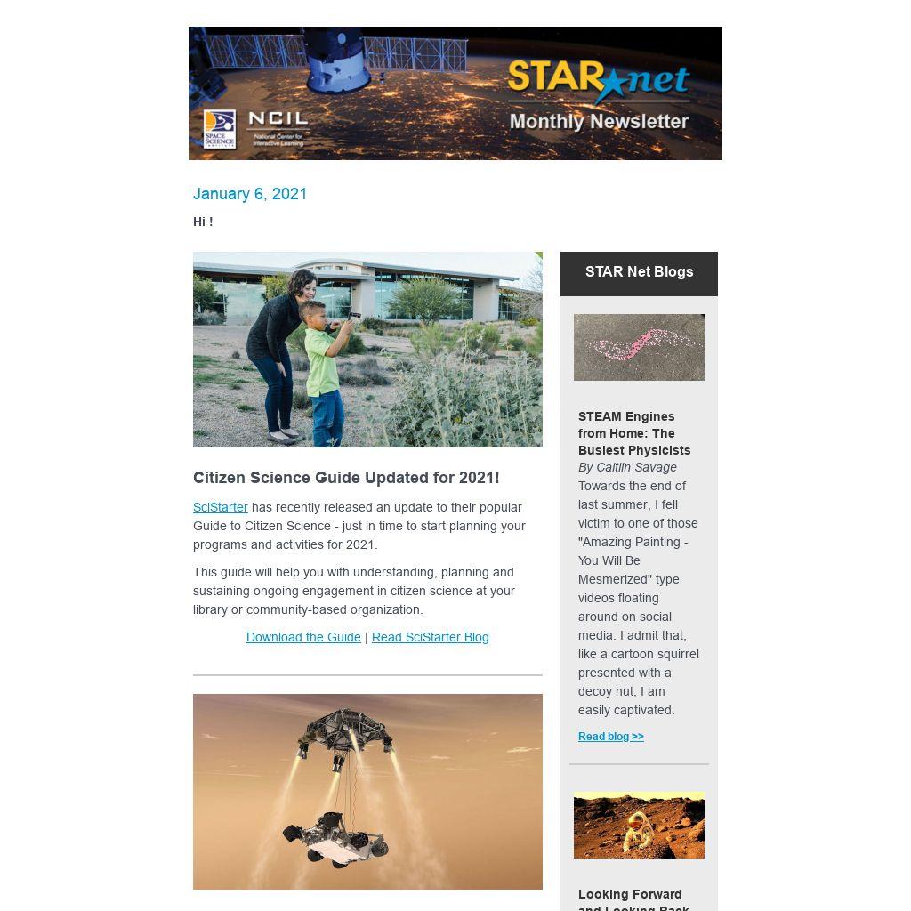 STAR Net is built upon a strong network of collaborators and partners, led by the Space Science Institute’s (SSI) National Center for Interactive Learning (NCIL). Partners include the American Library Association’s Public Programs Office, Collaborative Summer Library Program, Chief Officers of State Library Agencies, Lunar and Planetary Institute, Education Development Center, Twin Cities PBS (TPT), Institute for Learning Innovation (ILI), University of Colorado, University of Virginia, Urban Libraries Council, American Society of Civil Engineers, and Cornerstones of Science. Funding is provided by the National Science Foundation, NASA Science Mission Directorate, and the Institute of Museum and Library Services.