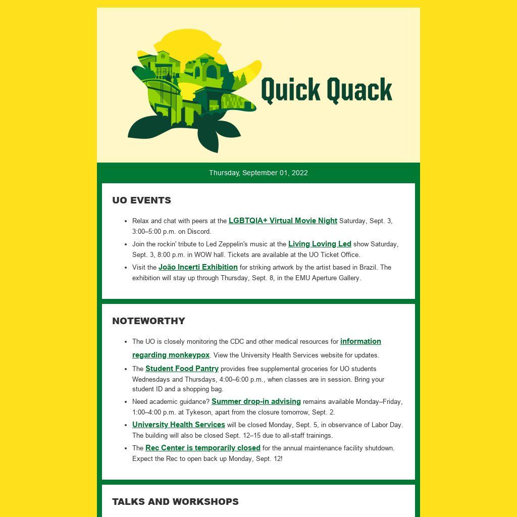 The UO is closely monitoring the CDC and other medical resources for information regarding monkeypox. View the University Health Services website for updates.