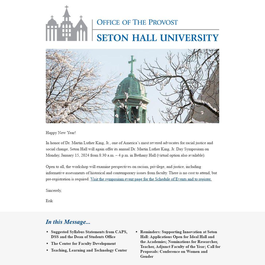 In honor of Dr. Martin Luther King, Jr., one of America’s most revered advocates for racial justice and social change, Seton Hall will again offer its annual Dr. Martin Luther King, Jr. Day Symposium on Monday, January 15, 2024 from 8:30 a.m. – 4 p.m. in Bethany Hall (virtual option also available).