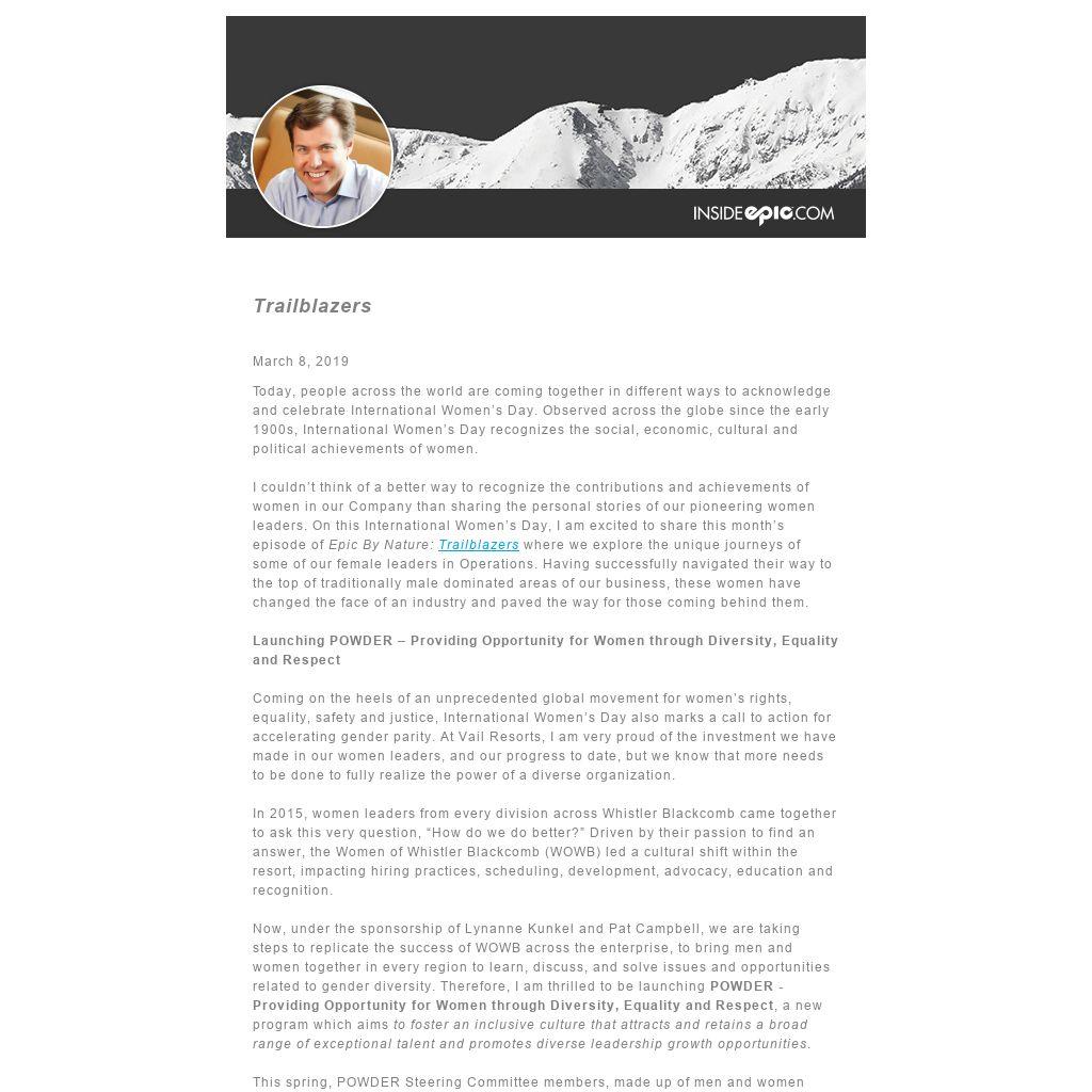Coming on the heels of an unprecedented global movement for women’s rights, equality, safety and justice, International Women’s Day also marks a call to action for accelerating gender parity. At Vail Resorts, I am very proud of the investment we have made in our women leaders, and our progress to date, but we know that more needs to be done to fully realize the power of a diverse organization.