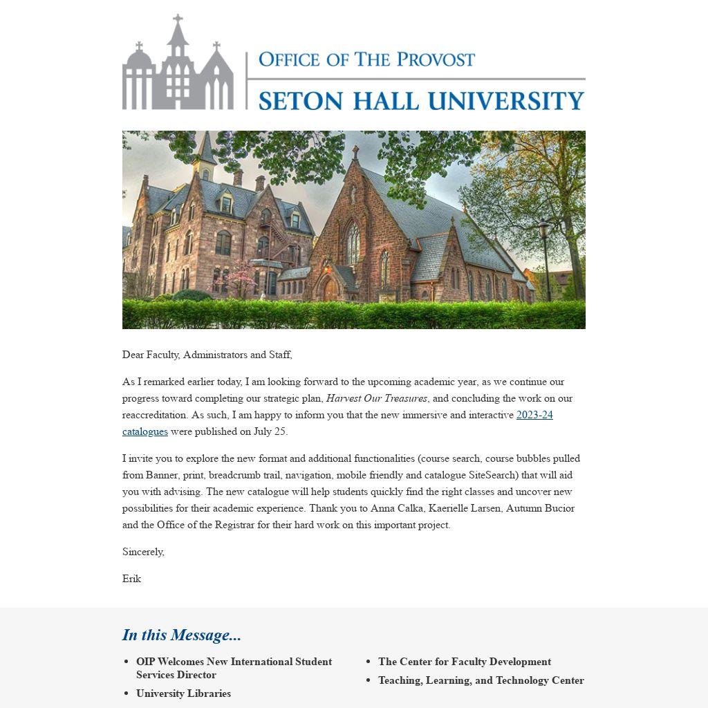 As I remarked earlier today, I am looking forward to the upcoming academic year, as we continue our progress toward completing our strategic plan, Harvest Our Treasures, and concluding the work on our reaccreditation. As such, I am happy to inform you that the new immersive and interactive 2023-24 catalogues were published on July 25.