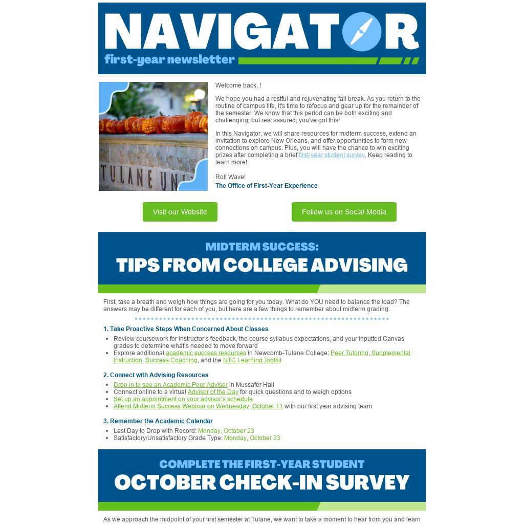 In this Navigator, we will share resources for midterm success, extend an invitation to explore New Orleans, and offer opportunities to form new connections on campus. Plus, you will have the chance to win exciting prizes after completing a brief first-year student survey. Keep reading to learn more!