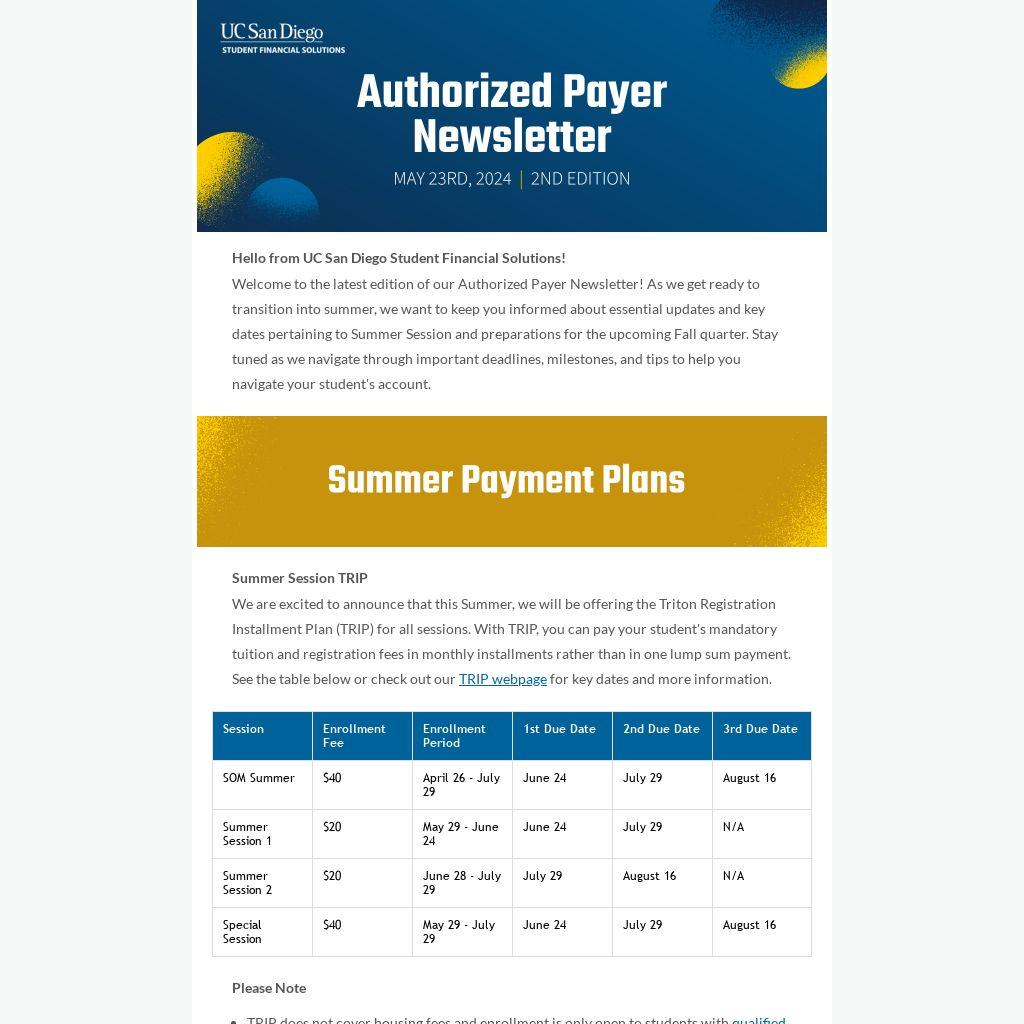 Welcome to the latest edition of our Authorized Payer Newsletter! As we get ready to transition into summer, we want to keep you informed about essential updates and key dates pertaining to Summer Session and preparations for the upcoming Fall quarter. Stay tuned as we navigate through important deadlines, milestones, and tips to help you navigate your student's account.