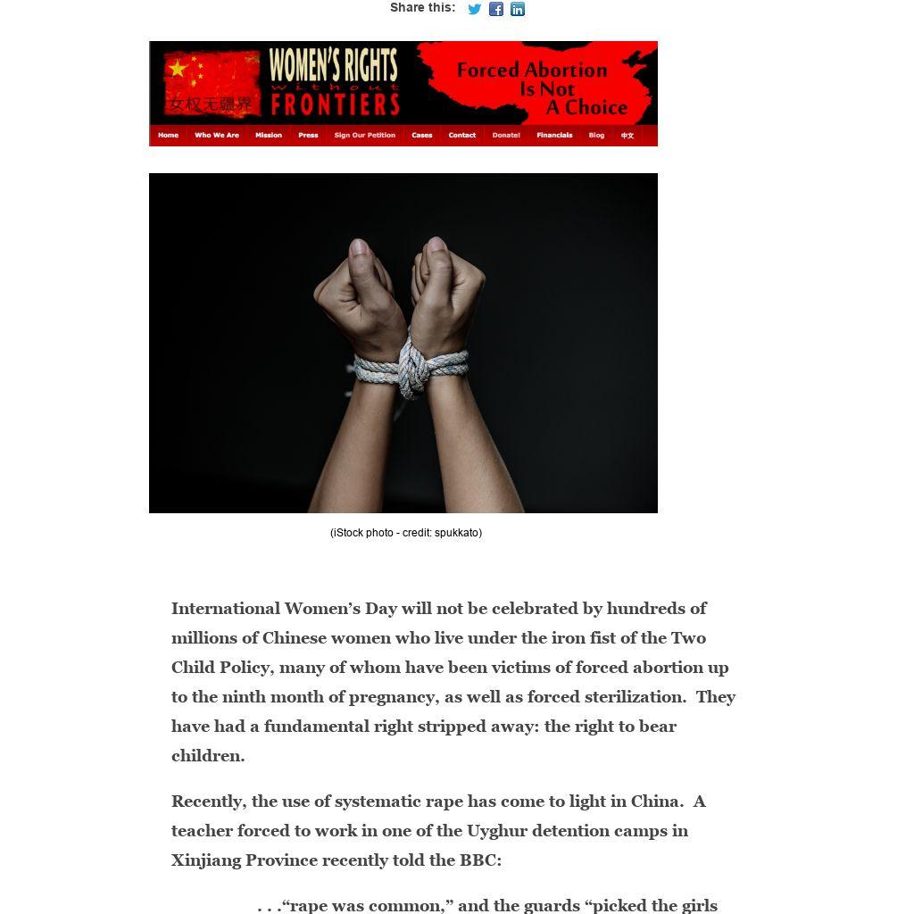 International Women’s Day will not be celebrated by hundreds of millions of Chinese women who live under the iron fist of the Two Child Policy, many of whom have been victims of forced abortion up to the ninth month of pregnancy, as well as forced sterilization. They have had a fundamental right stripped away: the right to bear children.