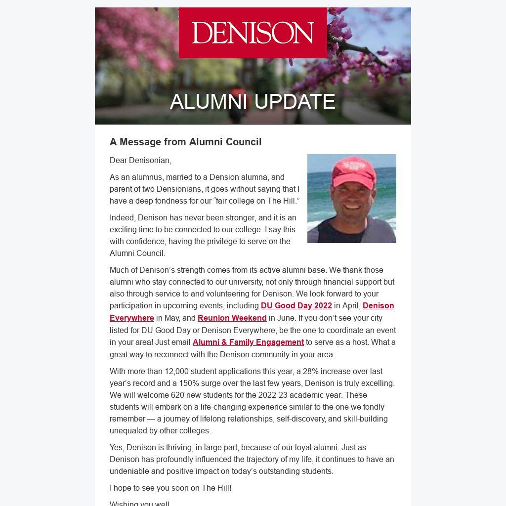 Indeed, Denison has never been stronger, and it is an exciting time to be connected to our college. I say this with confidence, having the privilege to serve on the Alumni Council.