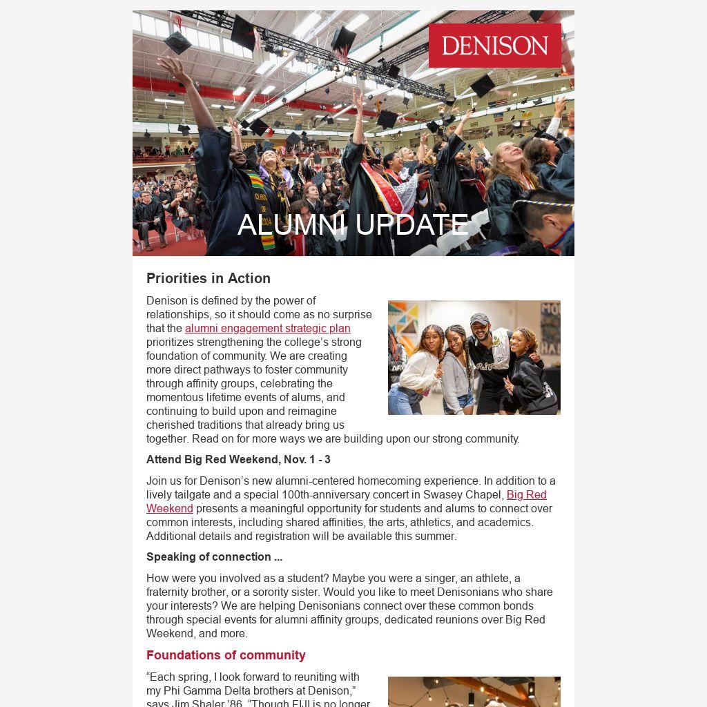 Join us for Denison ’s new alumni-centered homecoming experience. In addition to a lively tailgate and a special 100th-anniversary concert in Swasey Chapel, Big Red Weekend presents a meaningful opportunity for students and alums to connect over common interests, including shared affinities, the arts, athletics, and academics. Additional details and registration will be available this summer.