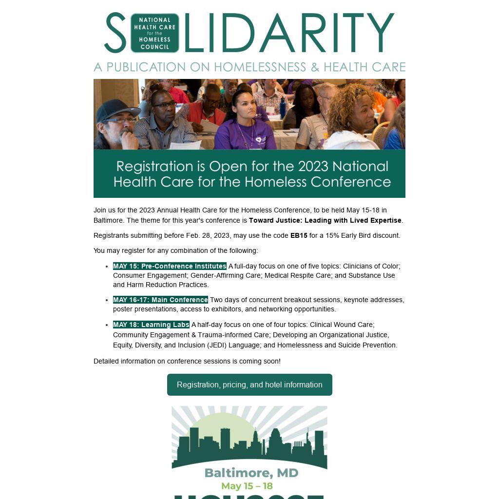 Join us for the 2023 Annual Health Care for the Homeless Conference, to be held May 15-18 in Baltimore. The theme for this year's conference is Toward Justice: Leading with Lived Expertise.