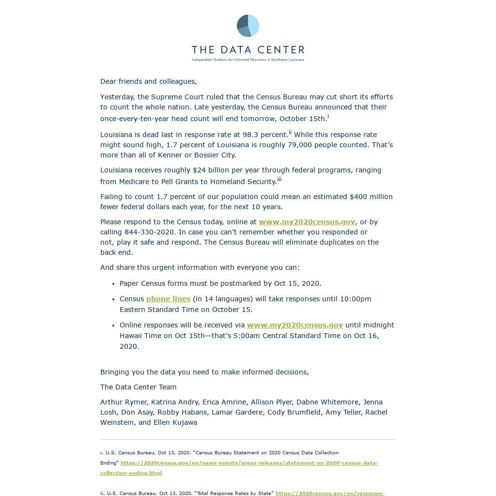 - Paper Census forms must be postmarked by Oct 15, 2020.