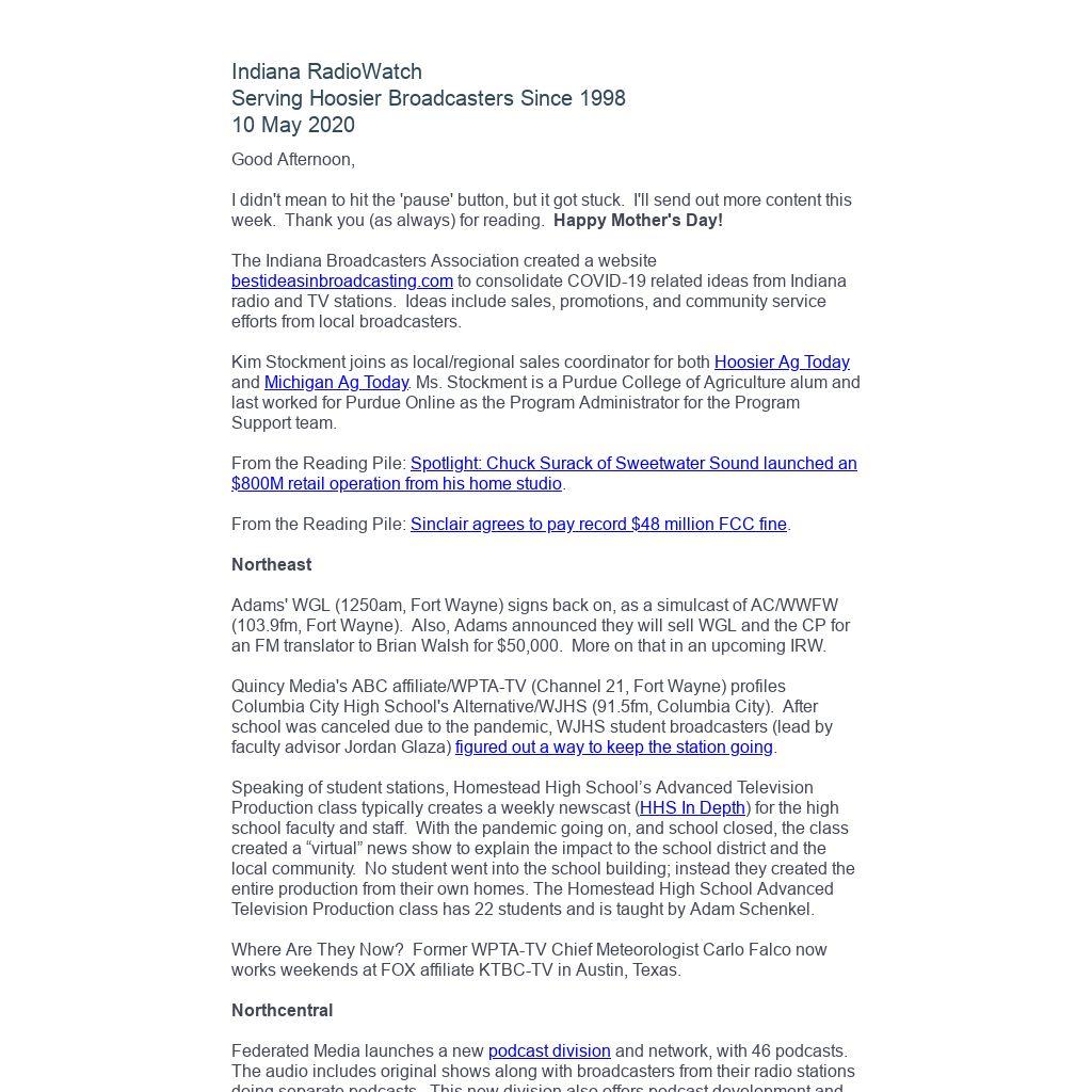 Indiana RadioWatch subscriptions are free. To subscribe, send an e-mail to irw@well.com and we'll add you. After publication, we archive Indiana RadioWatch on the Indiana Radio Archive at indianaradio.net. Please e-mail us your news stories and employment opportunities.