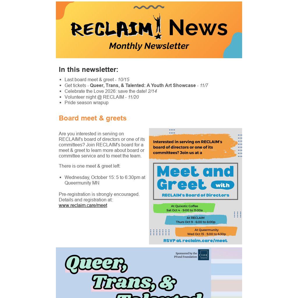 Hang out with queers and friends at RECLAIM on Thursday, November 20 from 5:30 to 7:30 pm. We'll work on our end-of-year fundraising projects like Give to the Max Day. Activities may include preparing mailings, writing postcards, or making phone calls. We'll also work on general preparations for Celebrate the Love on February 14, 2026.