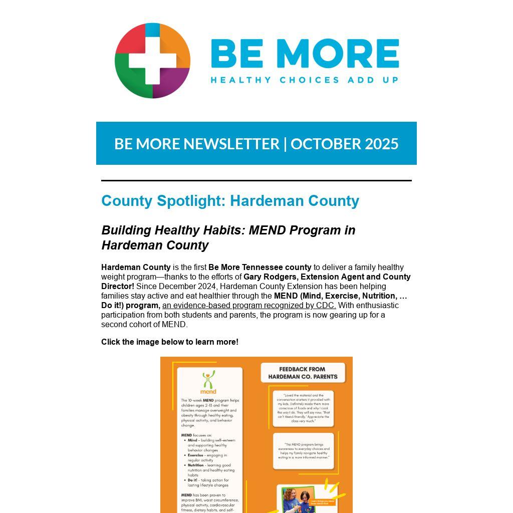 Hardeman County is the first Be More Tennessee county to deliver a family healthy weight program—thanks to the efforts of Gary Rodgers, Extension Agent and County Director! Since December 2024, Hardeman County Extension has been helping families stay active and eat healthier through the MEND (Mind, Exercise, Nutrition, … Do it!) program, an evidence-based program recognized by CDC. With enthusiastic participation from both students and parents, the program is now gearing up for a second cohort of MEND.