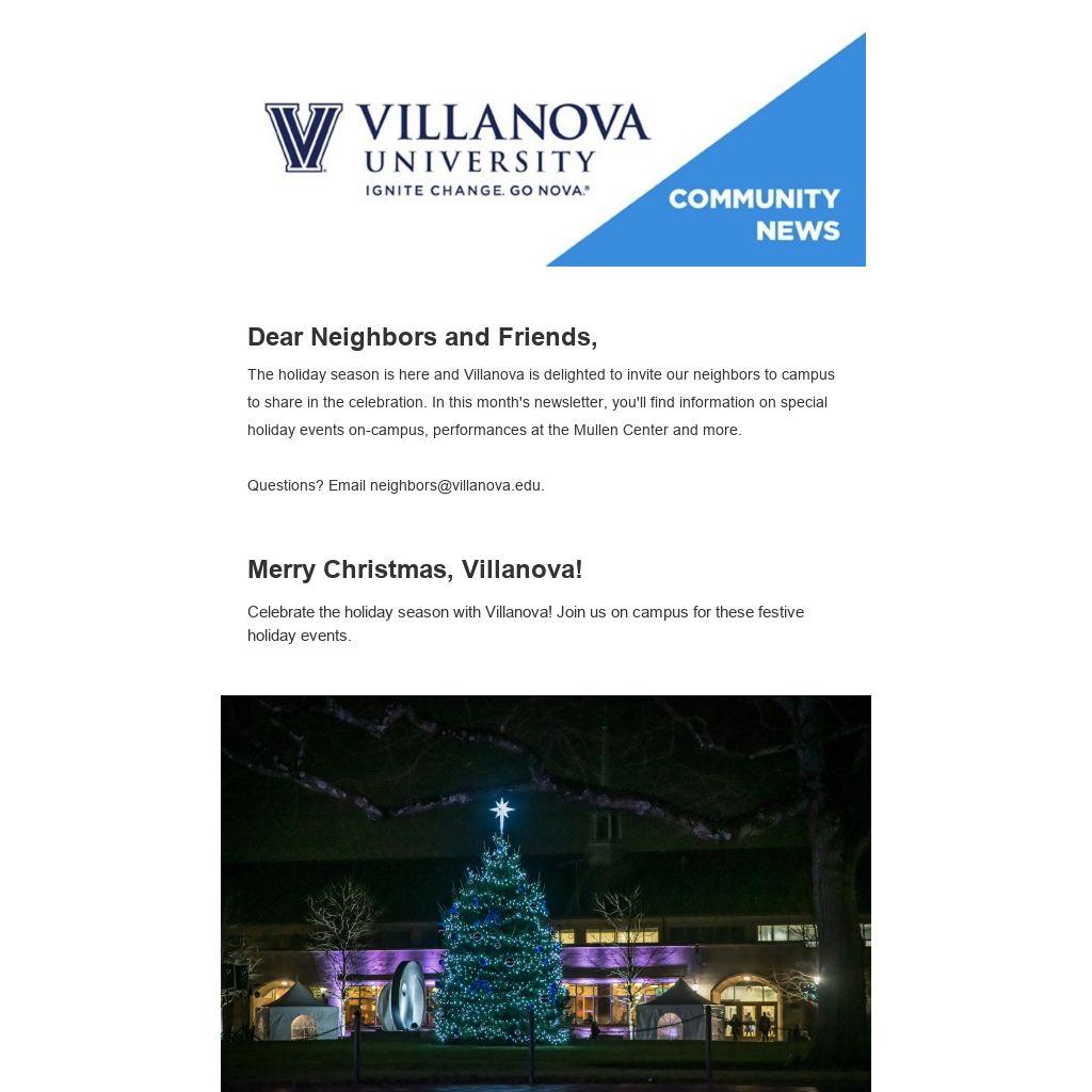 Join in this annual community event and enjoy festive treats, a Blessing of the Children, performances from the Villanova Voices & Singers, a holiday light show, firepits and s'mores, and a special visit from Santa!