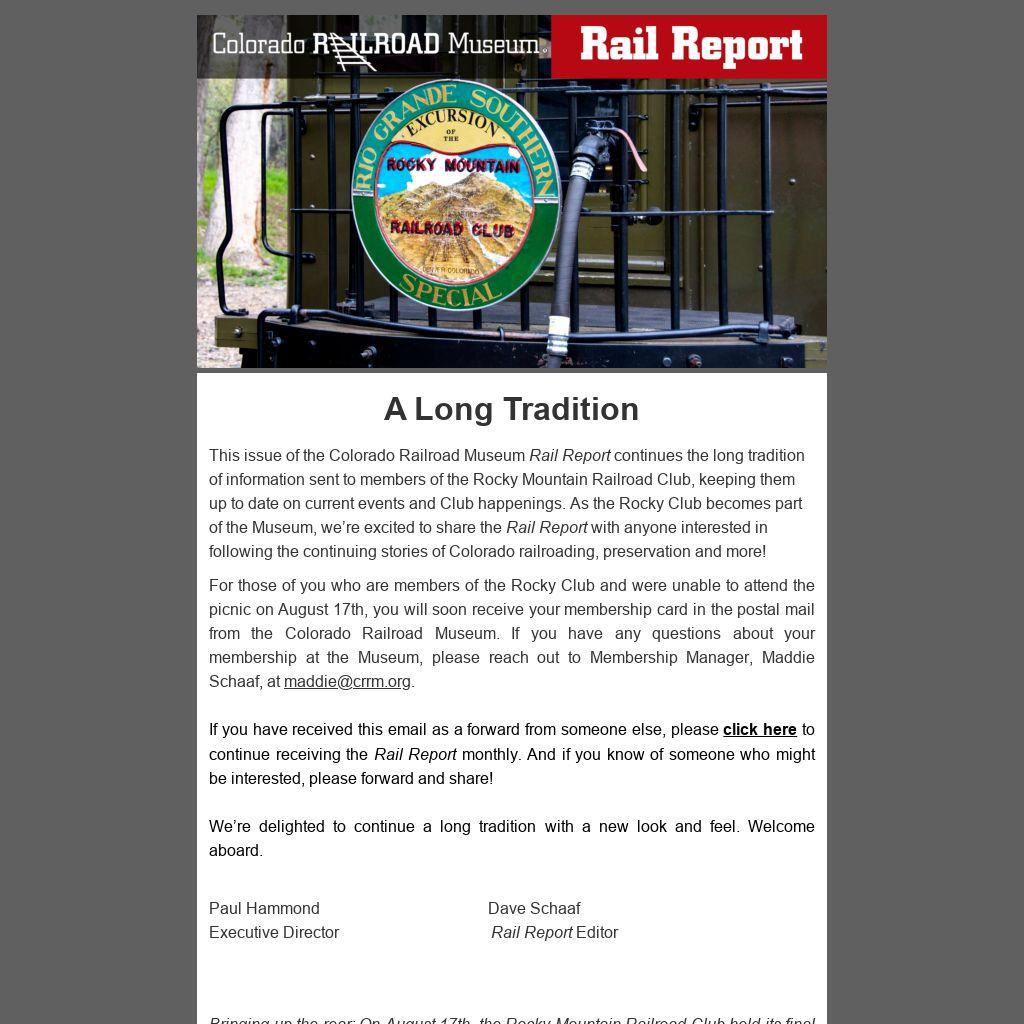If you have received this email as a forward from someone else, please click here to continue receiving the Rail Report monthly. And if you know of someone who might be interested, please forward and share!