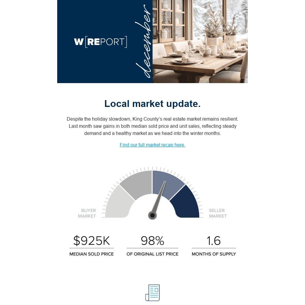 Despite the holiday slowdown, King County’s real estate market remains resilient. Last month saw gains in both median sold price and unit sales, reflecting steady demand and a healthy market as we head into the winter months.