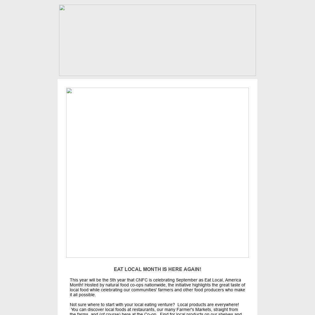 This year will be the 5th year that CNFC is celebrating September as Eat Local, America Month! Hosted by natural food co-ops nationwide, the initiative highlights the great taste of local food while celebrating our communities' farmers and other food producers who make it all possible.