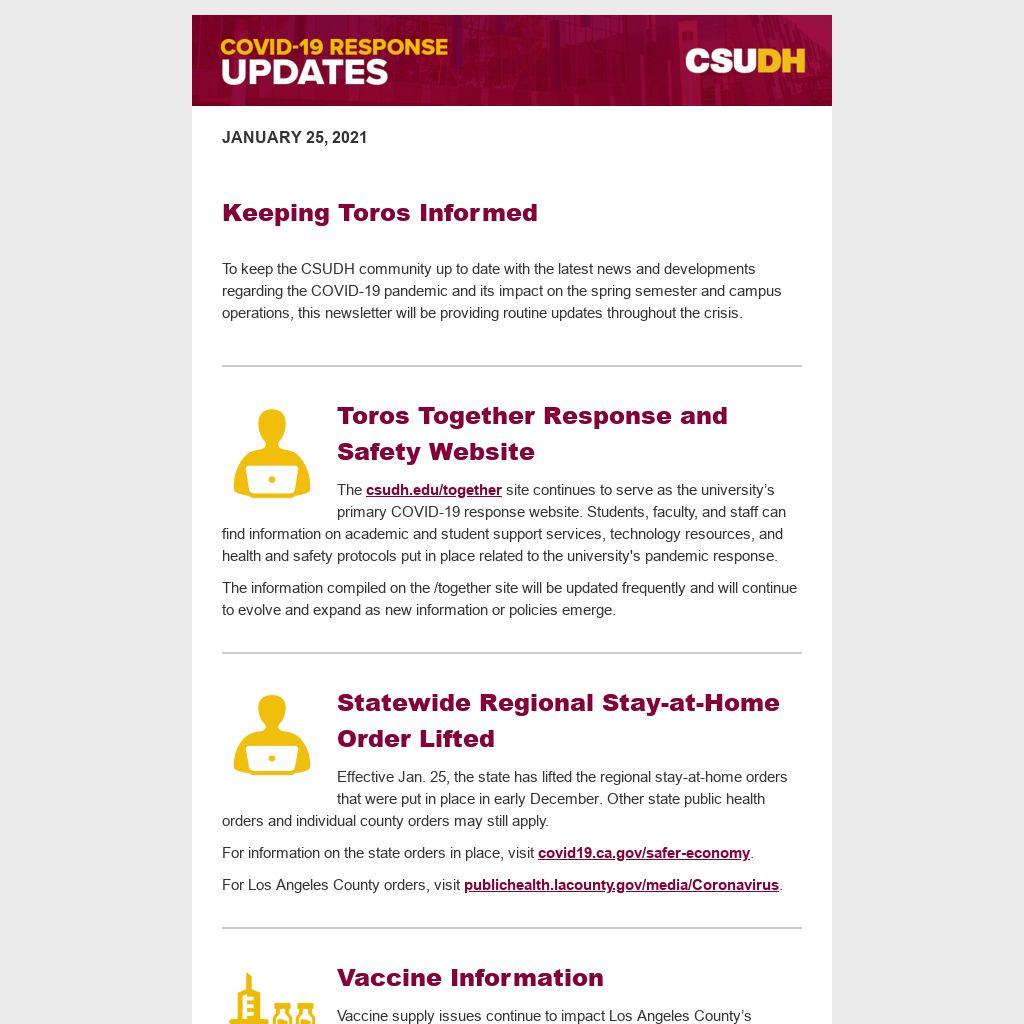 To keep the CSUDH community up to date with the latest news and developments regarding the COVID-19 pandemic and its impact on the spring semester and campus operations, this newsletter will be providing routine updates throughout the crisis.