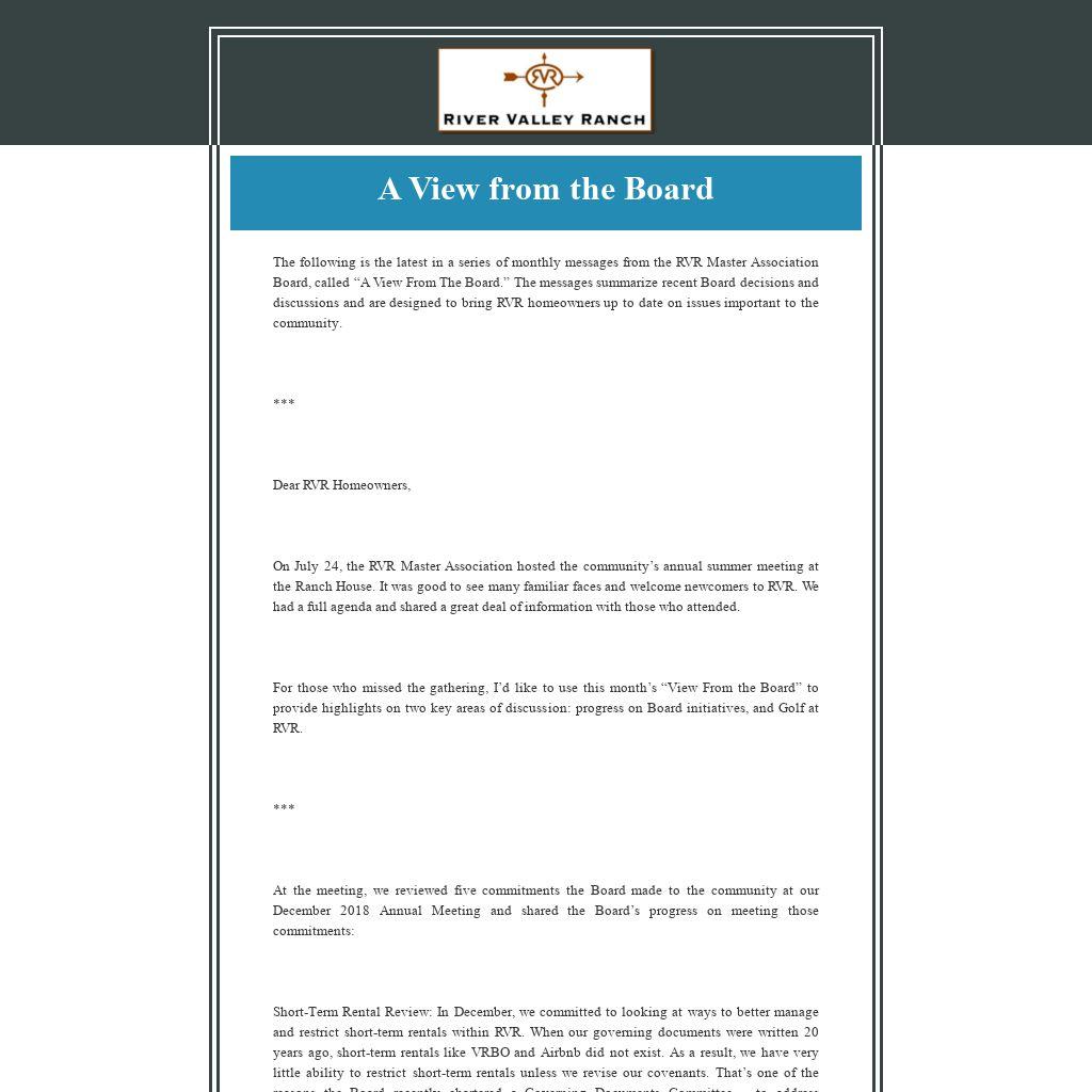 The following is the latest in a series of monthly messages from the RVR Master Association Board, called “A View From The Board.” The messages summarize recent Board decisions and discussions and are designed to bring RVR homeowners up to date on issues important to the community.
