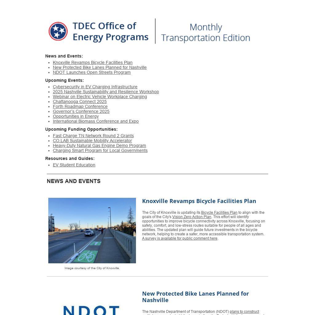 The City of Knoxville is updating its Bicycle Facilities Plan to align with the goals of the City's Vision Zero Action Plan. This effort will identify opportunities to improve bicycle connectivity across Knoxville, focusing on safety, comfort, and low-stress routes suitable for people of all ages and abilities. The updated plan will guide future investments in the bicycle network, helping to create a safer, more accessible transportation system. A survey is available for public comment here.