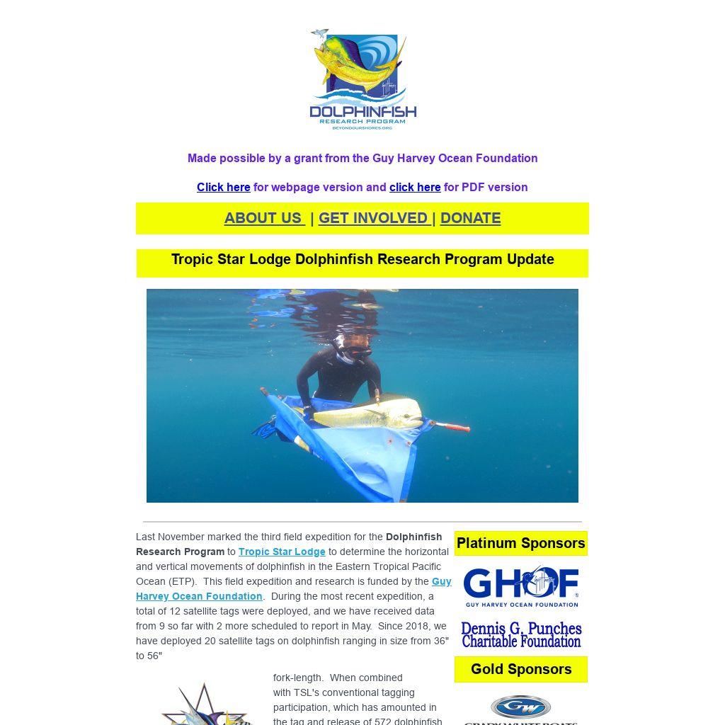 Last November marked the third field expedition for the Dolphinfish Research Program to Tropic Star Lodge to determine the horizontal and vertical movements of dolphinfish in the Eastern Tropical Pacific Ocean (ETP). This field expedition and research is funded by the Guy Harvey Ocean Foundation. During the most recent expedition, a total of 12 satellite tags were deployed, and we have received data from 9 so far with 2 more scheduled to report in May. Since 2018, we have deployed 20 satellite tags on dolphinfish ranging in size from 36" to 56"