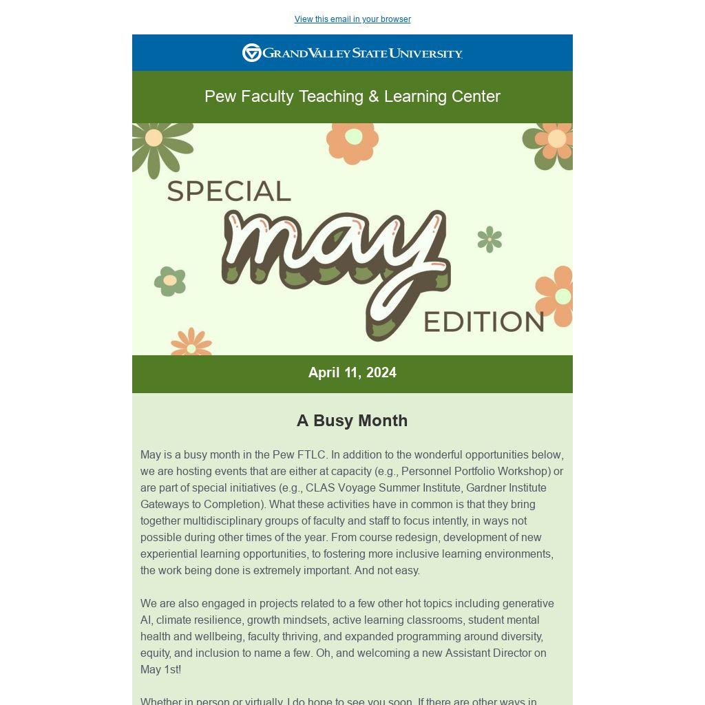 May is a busy month in the Pew FTLC. In addition to the wonderful opportunities below, we are hosting events that are either at capacity (e.g., Personnel Portfolio Workshop) or are part of special initiatives (e.g., CLAS Voyage Summer Institute, Gardner Institute Gateways to Completion). What these activities have in common is that they bring together multidisciplinary groups of faculty and staff to focus intently, in ways not possible during other times of the year. From course redesign, development of new experiential learning opportunities, to fostering more inclusive learning environments, the work being done is extremely important. And not easy.