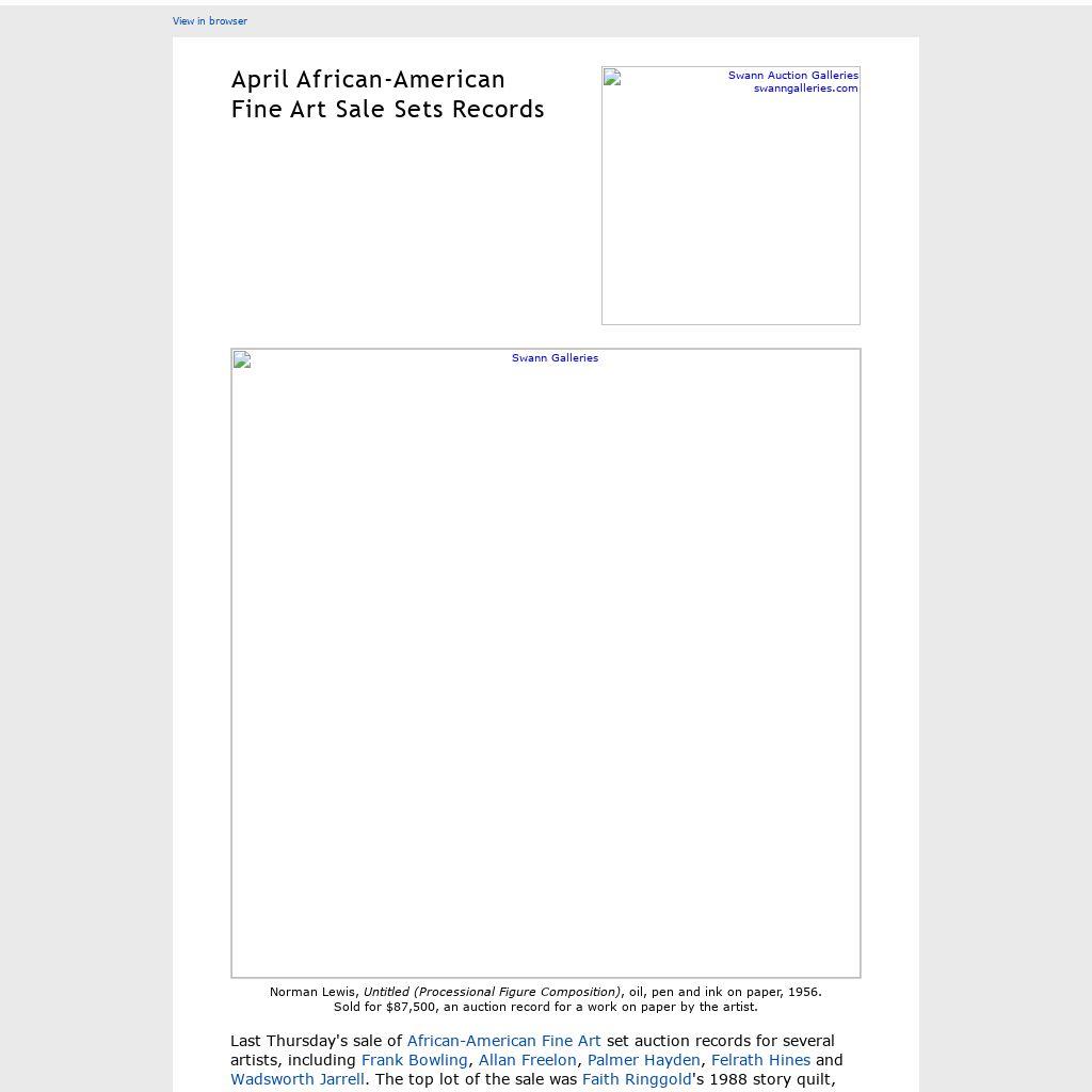 Fine Art Sale Sets Records | | | | | We are now accepting consignments for our next auction of African-American Fine Art in October 2016. If you have any questions or wish to consign, contact Director Nigel Freeman. | | | | | | |