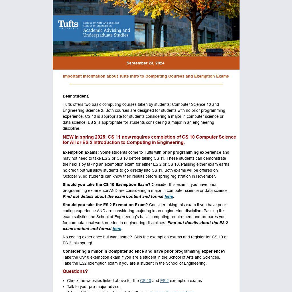 Exemption Exams: Some students come to Tufts with prior programming experience and may not need to take ES 2 or CS 10 before taking CS 11. These students can demonstrate their skills by taking an exemption exam for either ES 2 or CS 10. Passing either exam earns no credit but will allow students to go directly into CS 11. Both exams will be offered on October 9, so students can know their results before spring registration in November.