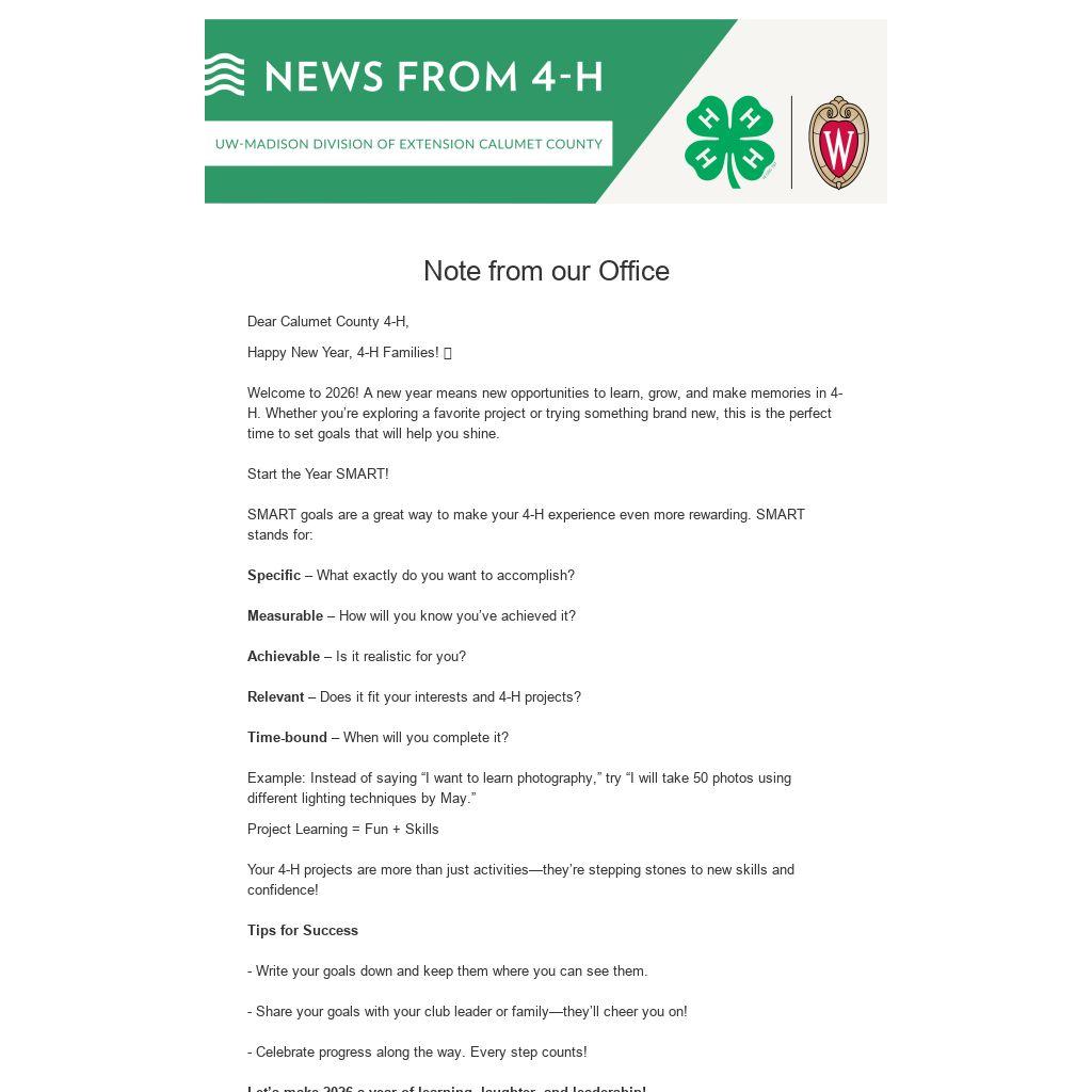 Let’s make 2026 a year of learning, laughter, and leadership! What SMART goal will you set for your 4-H journey this year? Share your ideas at the next club meeting or on our Facebook page! Here's a worksheet you can use to help you document your goals!