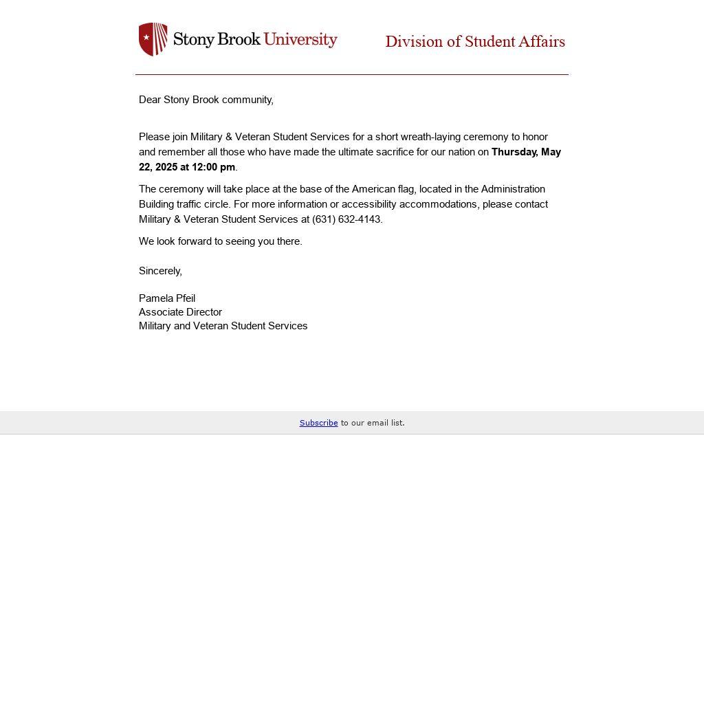 The ceremony will take place at the base of the American flag, located in the Administration Building traffic circle. For more information or accessibility accommodations, please contact Military & Veteran Student Services at (631) 632-4143.